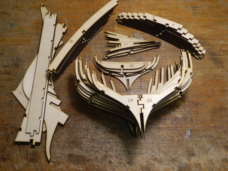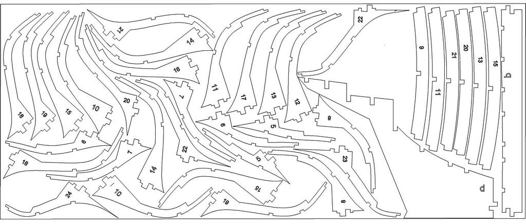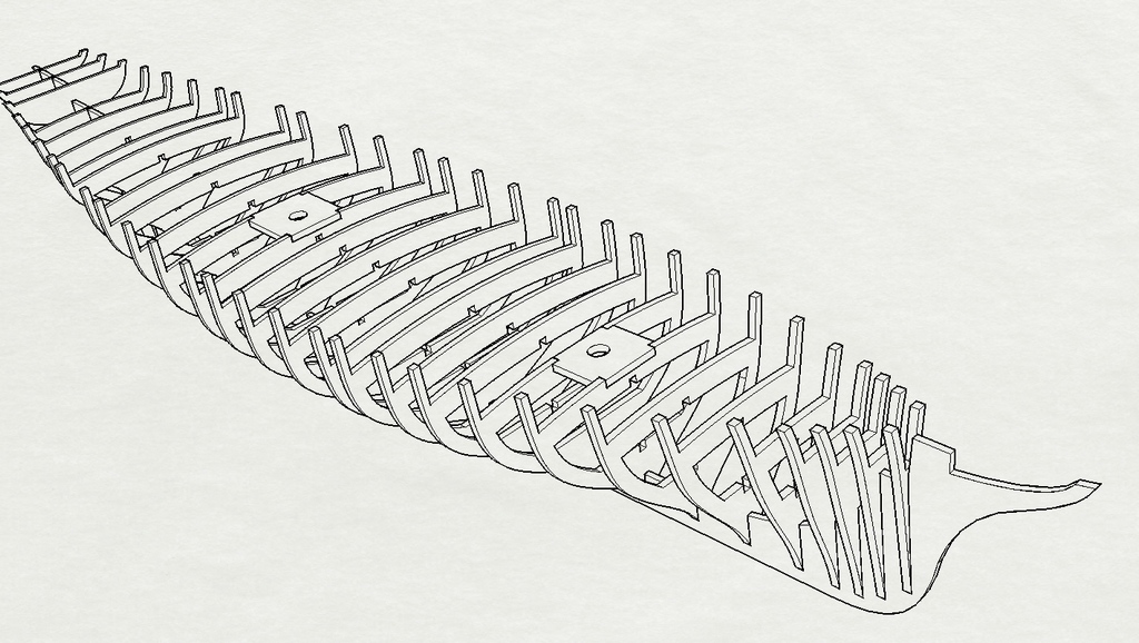 Целью разработки было создание чертежей для лазерного раскроя фанеры толщиной 5 мм с целью изготовления фанерного каркаса корпуса модели под дальнейшую обшивку. Сначала была создана 3D-модель корпуса ( внешней поверхности ) , затем путем вычитания толщины обшивки была получена внутренняя поверхность обшивки , по которой и строились профили фанерных шпангоутов. Учитывая высокую стоимось высококачественной авиационной фанеры шпангоуты сделаны составными , что позволит более рационально выполнить раскрой фанеры.