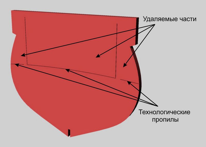 Далее нужно получить сечения корпуса в местах расположения технологических шпангоутов , которые образуют основу корпуса. Выбирается материал , например 10-мм фанера , и делаются соответвующие сечения корпус в предполагаемых местах размещения конструктивных шпангоутов. Здесь нужно сделать отступление , чтобы показать конструкцию шпангоута и сечение всего корпуса.