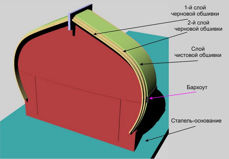 На этом рисунке показано сечение корпуса модели на стапеле. Стапель представляет собой кусок ламинированной ДСП подходящих размеров. Каждый шпангоут закреплен на стапеле парой шурупов-саморезов. Такая конструкция имеет достаточную жесткость и гарантирует сохранение размеров в процессе обшивки.