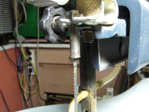 Saw blades holder for scroll saw Most desktop scroll saw designed for use blade with pin for fastening. My Einhell had included special clips, but he was broken and I make alternative holder , (see pictures ). Clip made out of steel on a lathe, in his pressed pin 1.8 mm from the broken drill bits. Saw soldered to the clip with soft solder (40% tin, 60% lead )