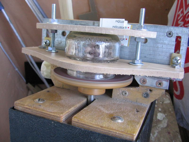 Tumbling machine Simple attachment to the sanders used to smooth the edges of blocks. The design is extremely simple: a glass jar of 100 ml is pressed against the grinding disk with a gap of 1 mm. Details poured into the jar. Processing time is approximately 10-15 minutes.